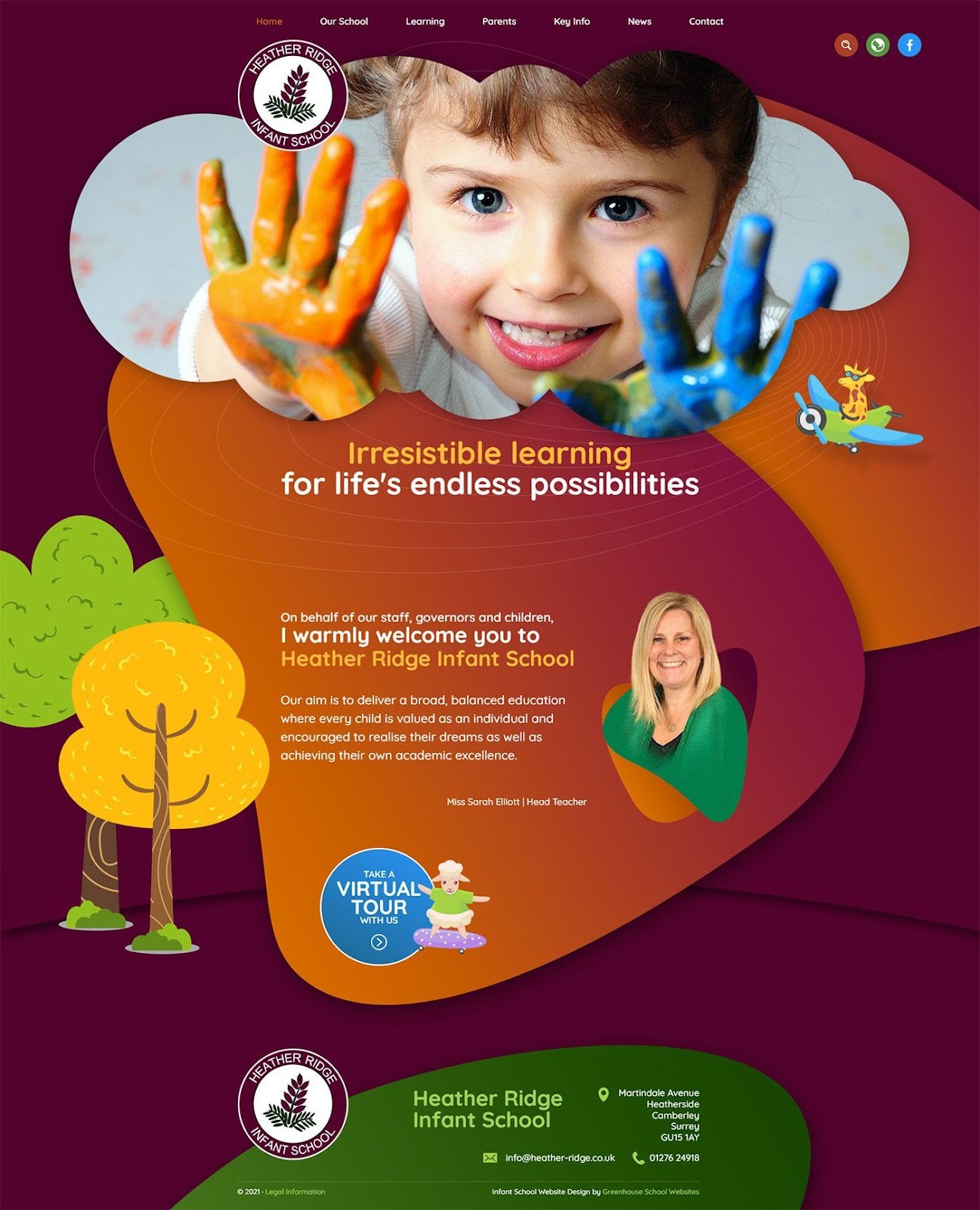 A joyful welcome with bold design and gorgeous photos helps visitors to warm to Heather Ridge Infant School.